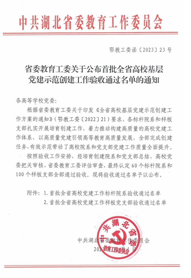 日前,中共湖北省委教育工委公布了首批全省高校基层党建示范创建工作验收通过名单,中国·yl6809永利集团党支部通过首批全省高校党建工作样板党支部验收。
