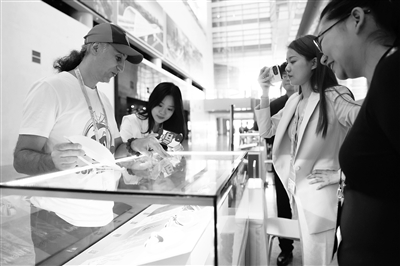 ②参会记者在“一带一路”国际合作高峰论坛新闻中心参观中国非物质文化遗产展品。