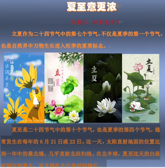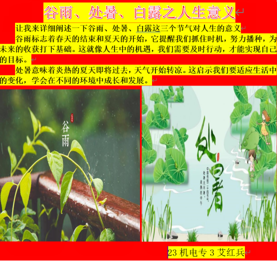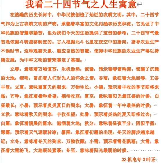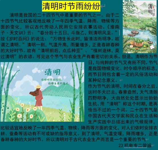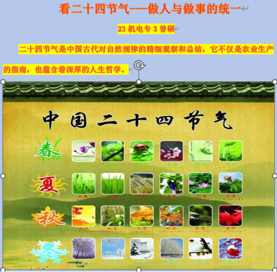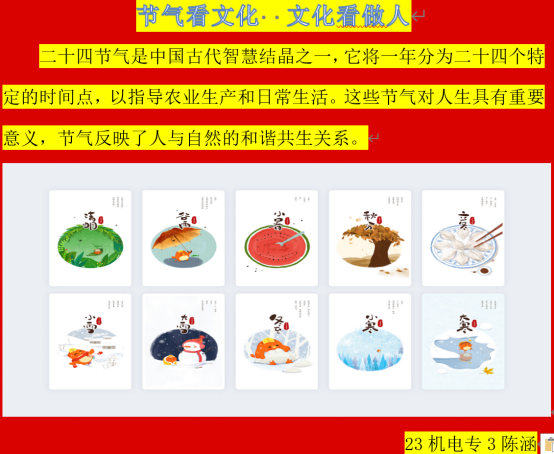 曾诚同学感悟到,二十四节气是流淌在每个中国人基因里的文化自信。、 既有“国际范”又能“接地气”,二十四节气充盈着科学的雨露,洋溢着文化的馨香,更是我们的诗和远方。它既是特别亲民的科学,又是特别家常的文化。”