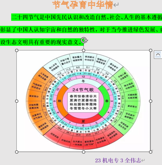阳鑫瑞同学感叹道,中华优秀传统文化是中华民族的精神命脉,是我们的文化自信的重要来源。二十四节气很好地诠释了做事与做人的深刻道理,通过挖掘,很好地实现了从自然气节到人生气节的过度与升华,