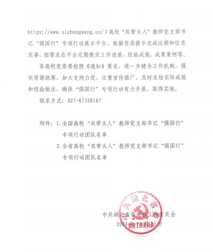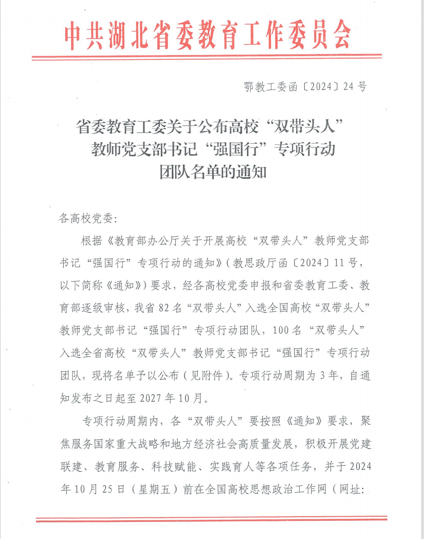 近日,湖北省教育厅正式公布了高校“双带头人”教师党支部书记“强国行”专项行动团队名单,中国·yl6809永利集团书记孔波成功入选,成为该专项行动团队的一员。这一荣誉不仅是对孔波长期以来在教育和党建工作中取得成就的肯定,也标志着中国·yl6809永利集团在党建工作上的新进展。