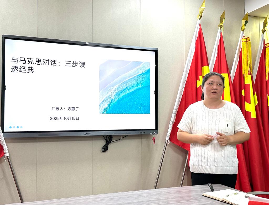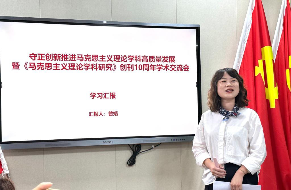曾婧老师则以《“守正创新推进马克思主义理论学科高质量发展暨〈马克思主义理论学科研究〉创刊10周年学术交流会”学习汇报》为题,带来了一场学术盛宴的“一线报道”。她详细介绍了2025年9月27日由武汉大学主办的学术交流会上,数十位马克思主义理论学界领军人物所作的主旨报告精髓,并向老师们介绍了会议所凝练的“马克思主义理论学科学术研究十大热点”,建议教师们以热点为锚点,深入开展教科研活动。谈及参会心得,曾婧老师动情分享:与顶尖学者对话让我深刻体会到,做学问既要如“登山者”般开拓视野、突破边界,又要如“工匠”般心怀敬畏、精雕细琢。学术之路没有捷径,唯有以热忱点燃初心,以韧性穿越迷茫,以定力守护方向,方能行稳致远。其真诚的感悟引发全场教师深思。
