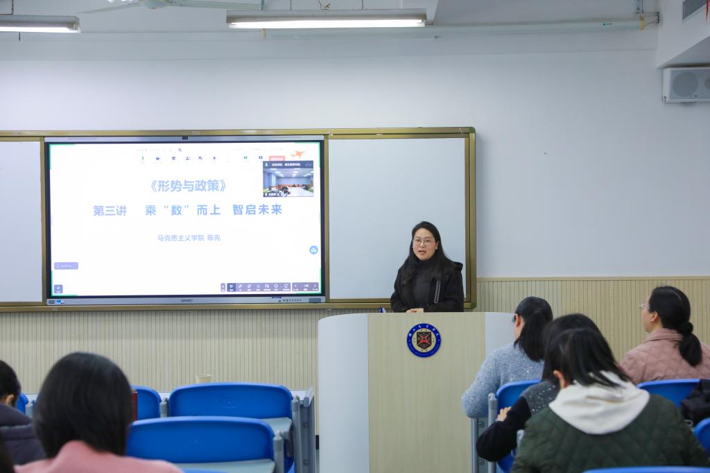 思政教研室主任陈先作示范课讲授,她从教学设计着手,以数字中国建设的战略背景、核心内涵、实践路径三个维度展开讲授。结合国家“十五五”规划纲要和2026年全国两会政府工作报告最新精神,结合了湖北省在智能制造、智慧城市、数字乡村等领域的创新实践,将宏观政策与民生改善紧密结合,整个教学节奏张弛有度、互动自然。在互动交流环节,钟蓉老师认为示范课“站位高、落点实”,特别是将湖北本土案例融入教学,可以增强学生的代入感和认同感。龙德爽老师点评道,整堂课有理有据有温度,数字技术发展的宏大叙事与老百姓日常生活的微观视角结合得当、重点突出,值得青年教师学习借鉴。与会教师纷纷表示,此次磨课收获满满,为讲好《形势与政策》课提供了清晰的教学参照和方法启示。