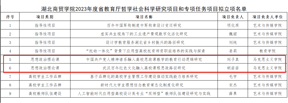 近日,从省教育厅2023年度哲学社会科学研究项目和专项任务项目拟立项结果获悉,我院胡苗苗、刘子真老师的思想政治理论课类别的课题获批立项。